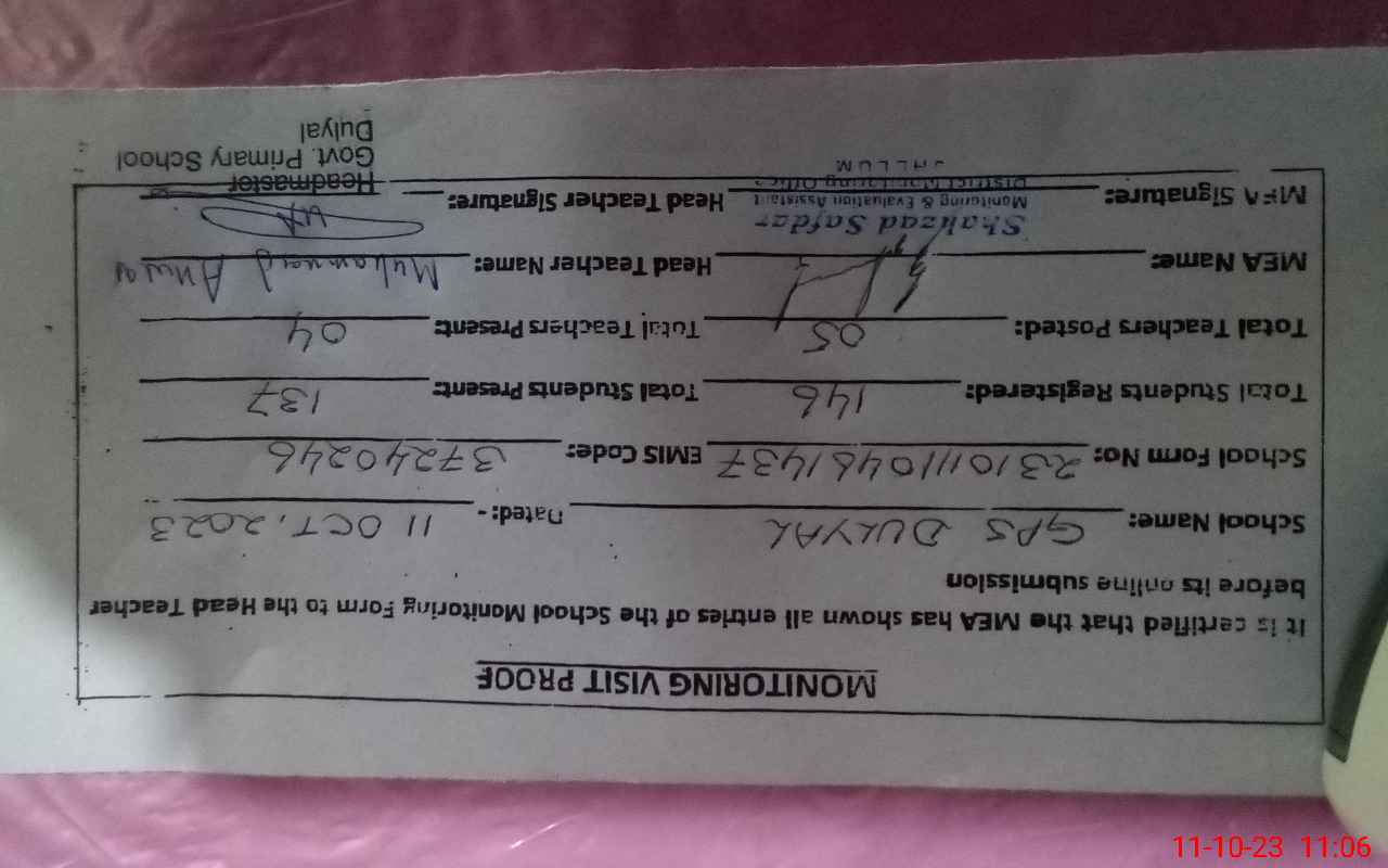 | Certified that this School was Inspected by the Undersigned MEA/DMO Today and the Information Stated Above is as Per Record. | |||||