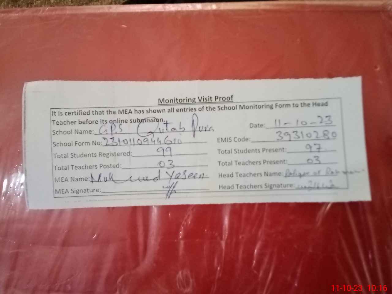 | EMIS Code: 39310280 | Name of School: GPS QUTAB PURA | |||
