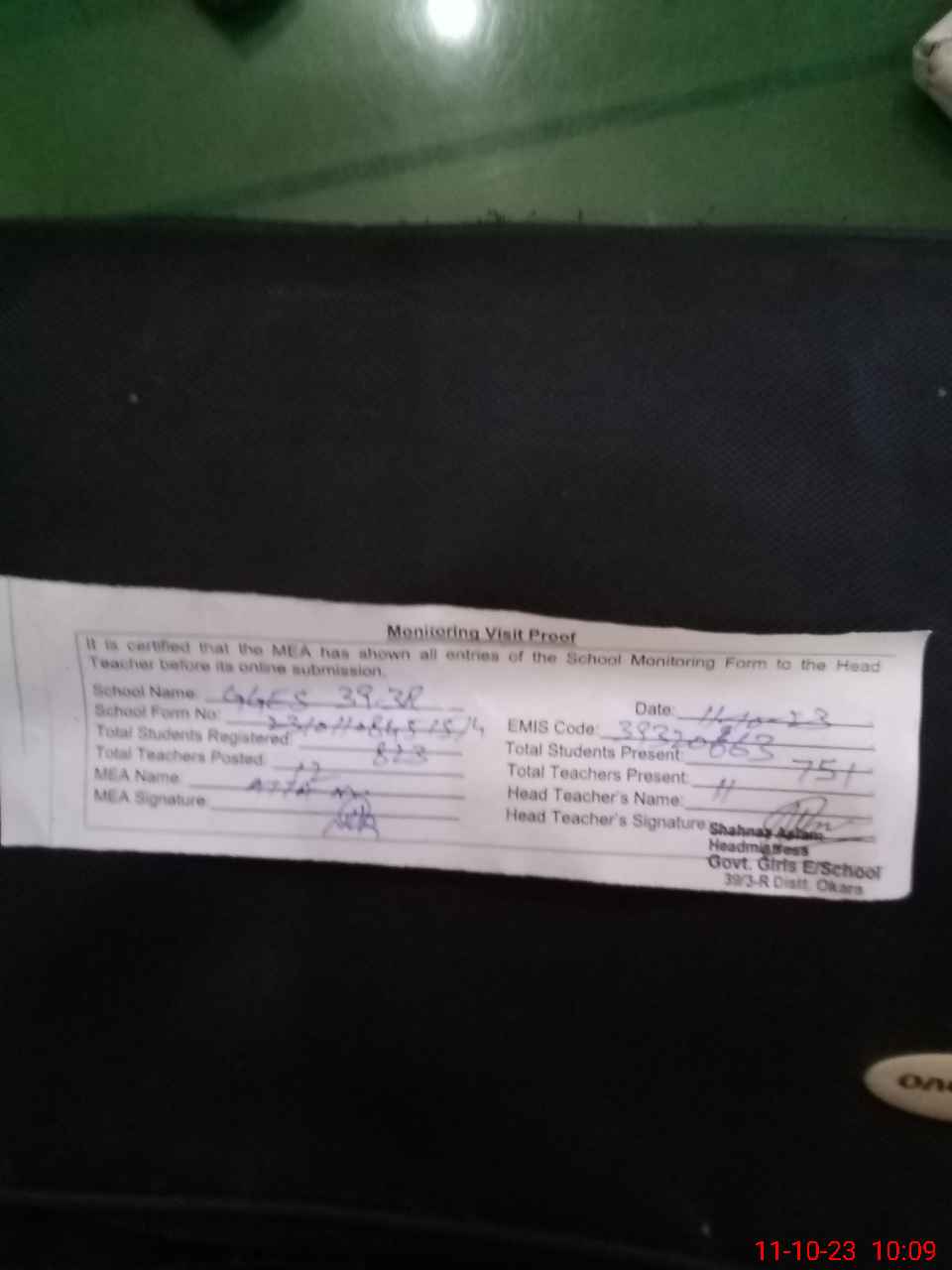 | Attendance Register | Head Teacher | MEA with School | Visit Proof |