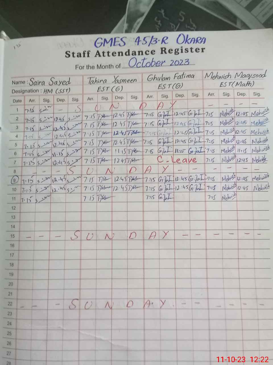 | CNIC | Full Name | Designation | R/C | Absence During Last Calender Month |