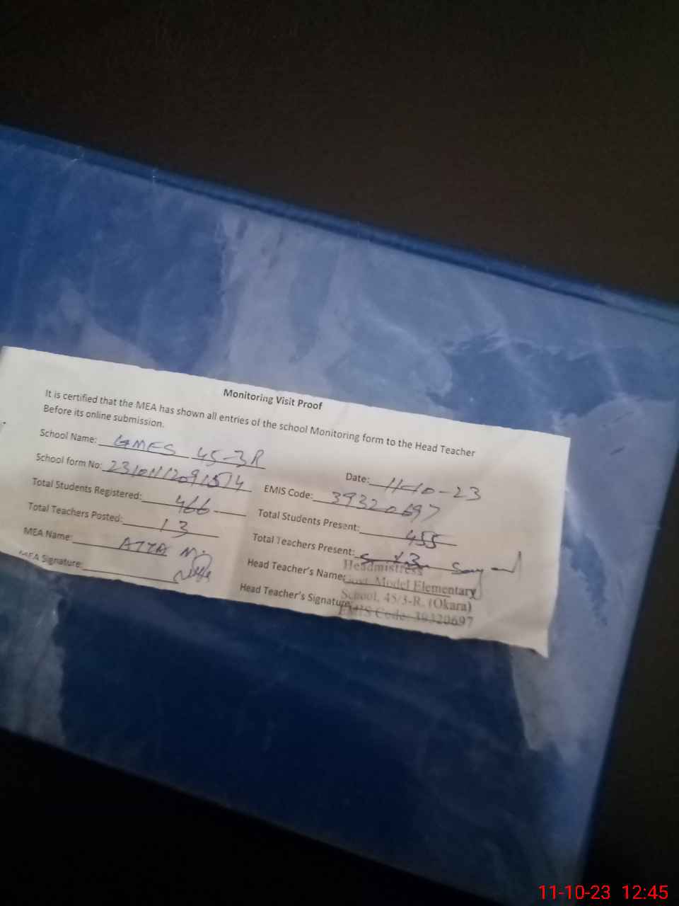 | Attendance Register | Head Teacher | MEA with School | Visit Proof |