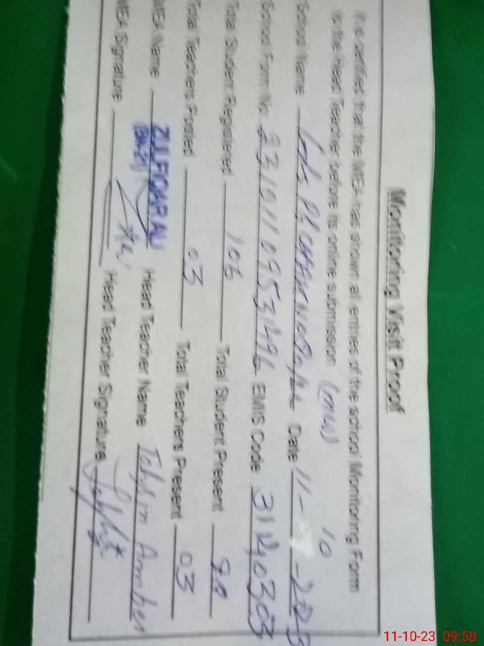 | Monitoring Date: 11-10-2023 | Start Time: 11-10-2023 09:45 AM | End Time: 11-10-2023 09:58 AM | Name of MEA: Zu**** Al**** BN**** | |