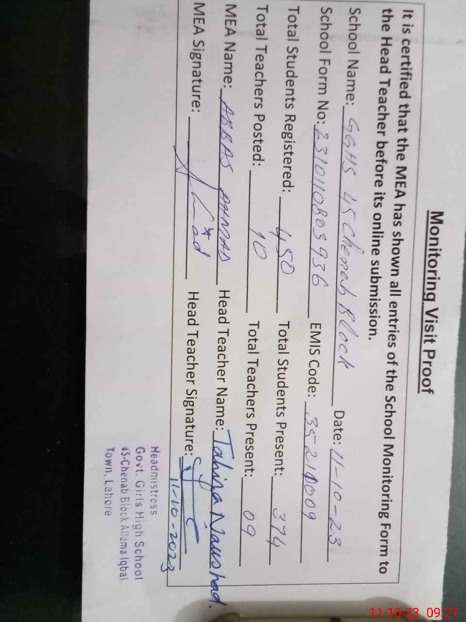 | EMIS Code: 35211009 | Name of School: GGHS 45- CHENAB BLOCK ALLAMA IQBAL TOWN | |||