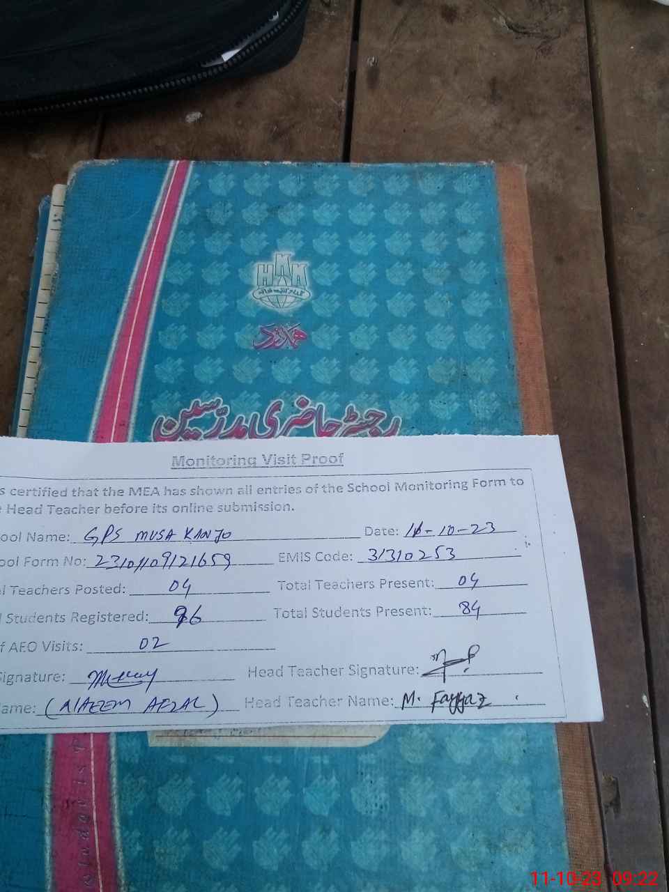 | Attendance Register | Head Teacher | MEA with School | Visit Proof |