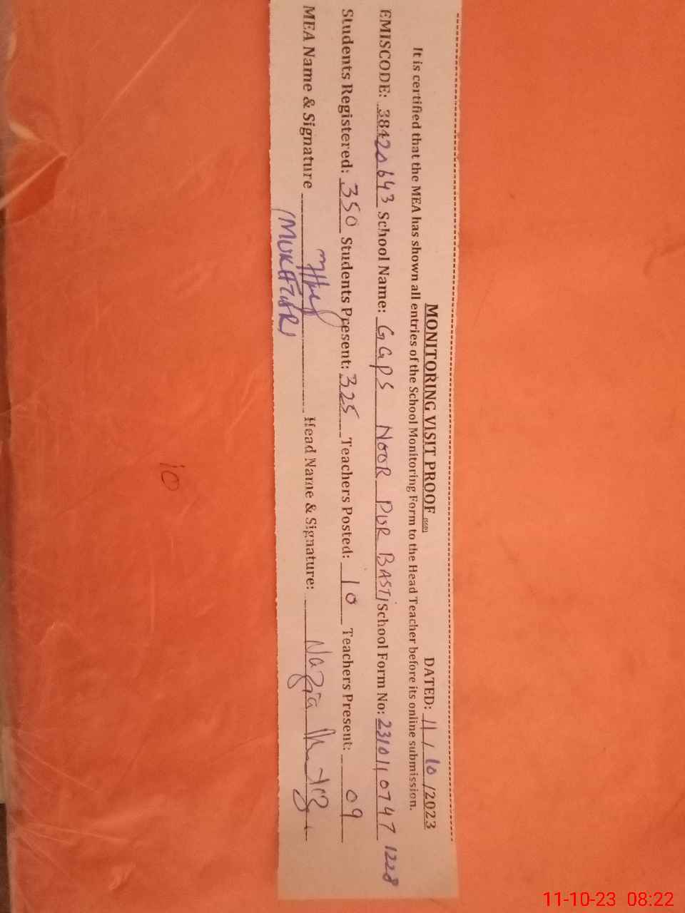 | Certified that this School was Inspected by the Undersigned MEA/DMO Today and the Information Stated Above is as Per Record. | |||||