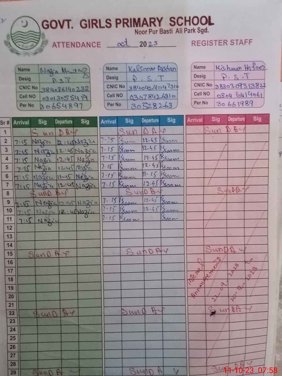 | CNIC | Full Name | Designation | R/C | Absence During Last Calender Month |
