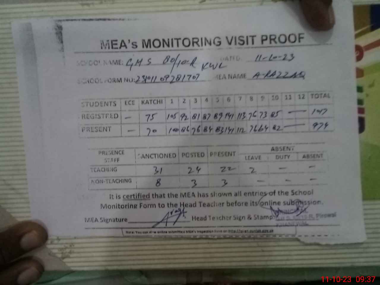 | Attendance Register | Head Teacher | MEA with School | Visit Proof |