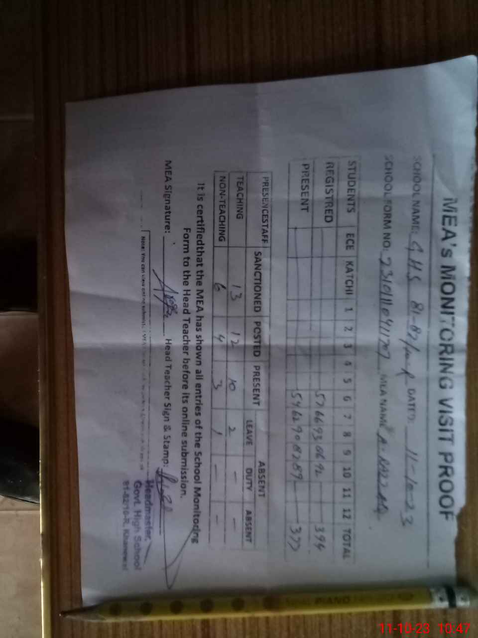 | Attendance Register | Head Teacher | MEA with School | Visit Proof |
