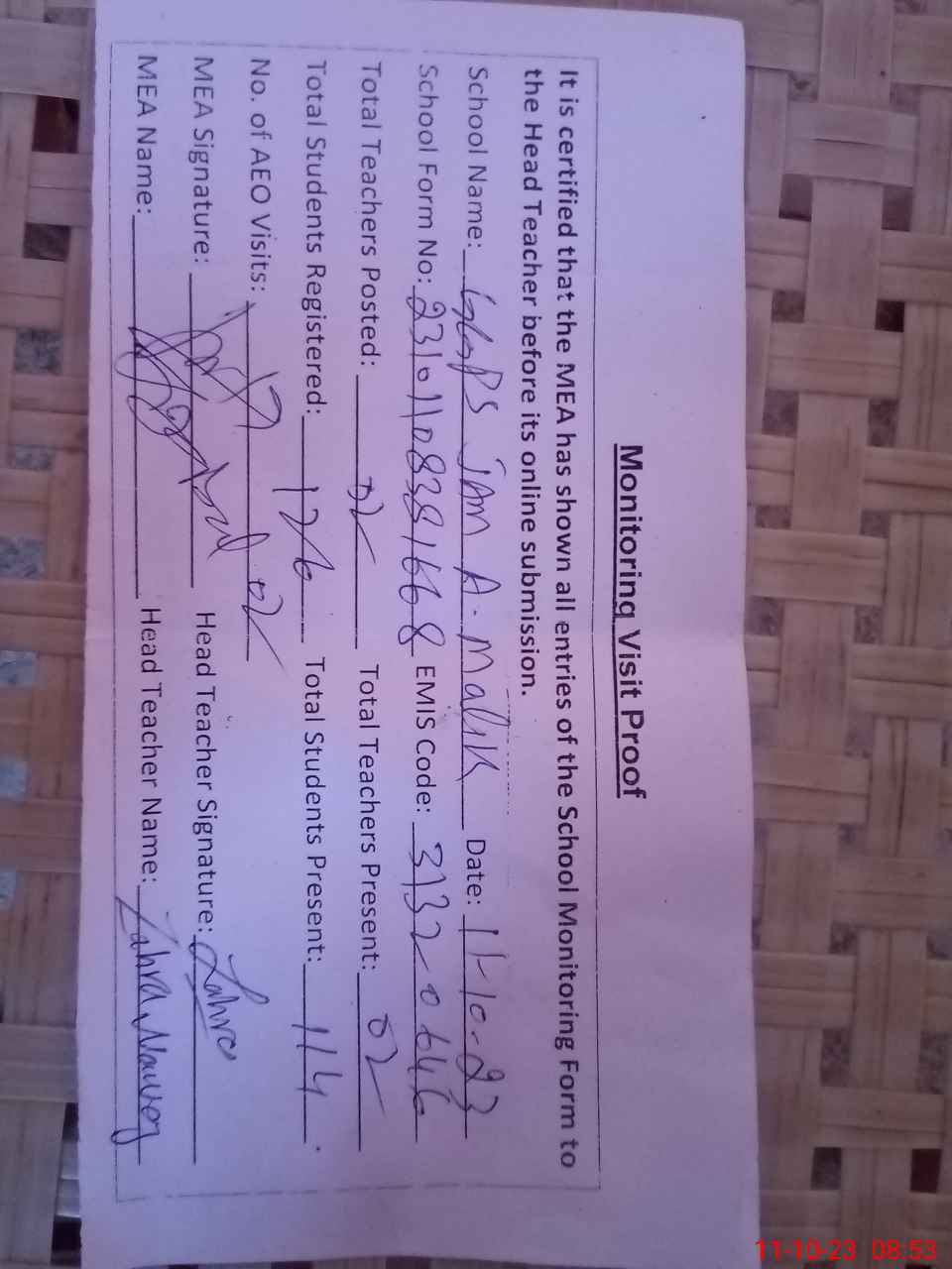 | EMIS Code: 31320646 | Name of School: GGPS JAM ABDUL MALIK | |||