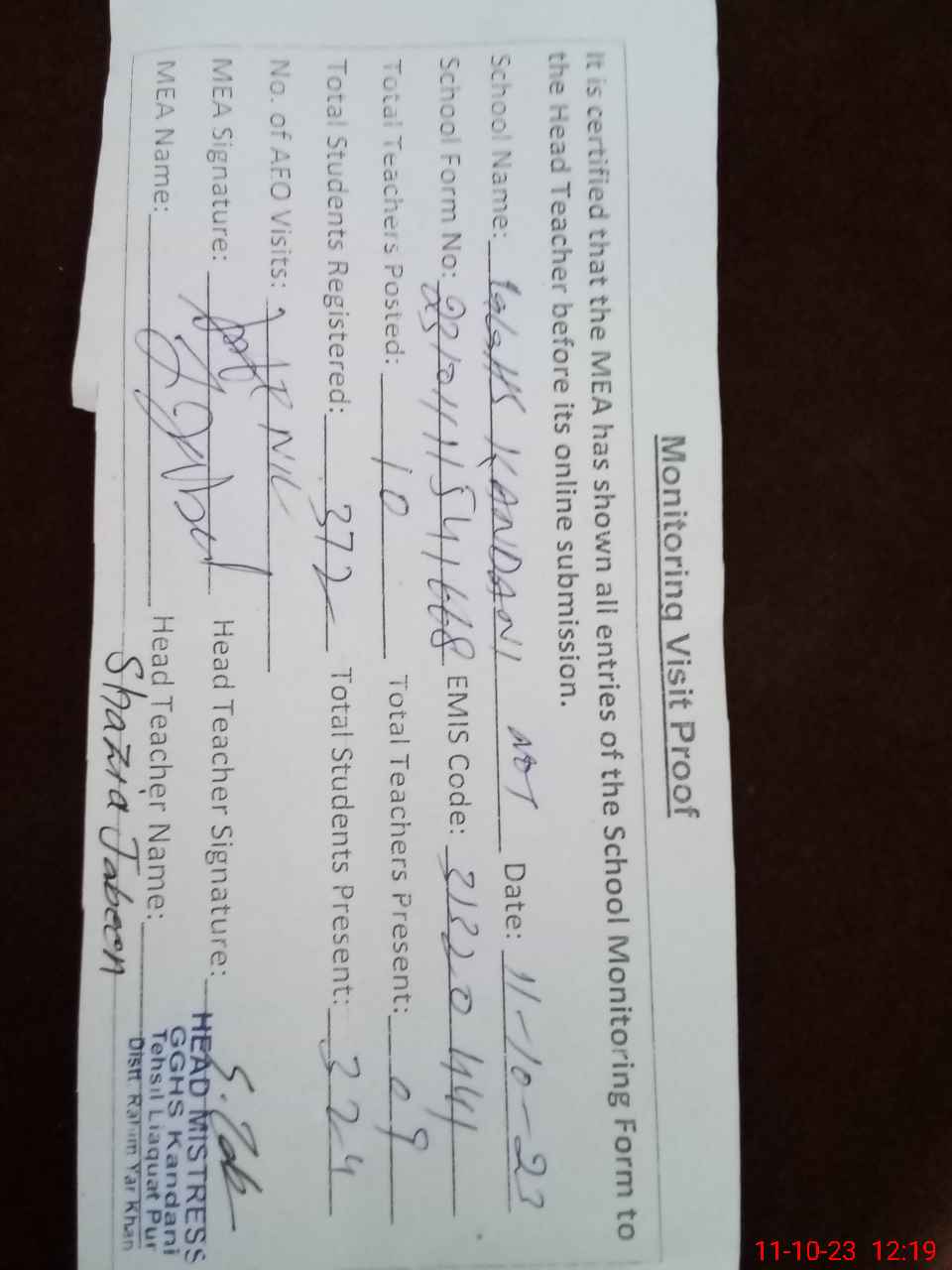 | Monitoring Date: 11-10-2023 | Start Time: 11-10-2023 11:54 AM | End Time: 11-10-2023 12:20 PM | Name of MEA: Za**** Iq**** | |