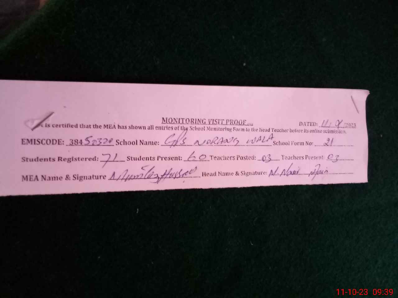 | Certified that this School was Inspected by the Undersigned MEA/DMO Today and the Information Stated Above is as Per Record. | |||||