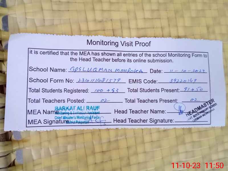 | EMIS Code: 39220149 | Name of School: GPS LUQMAN MEHRO KA | |||