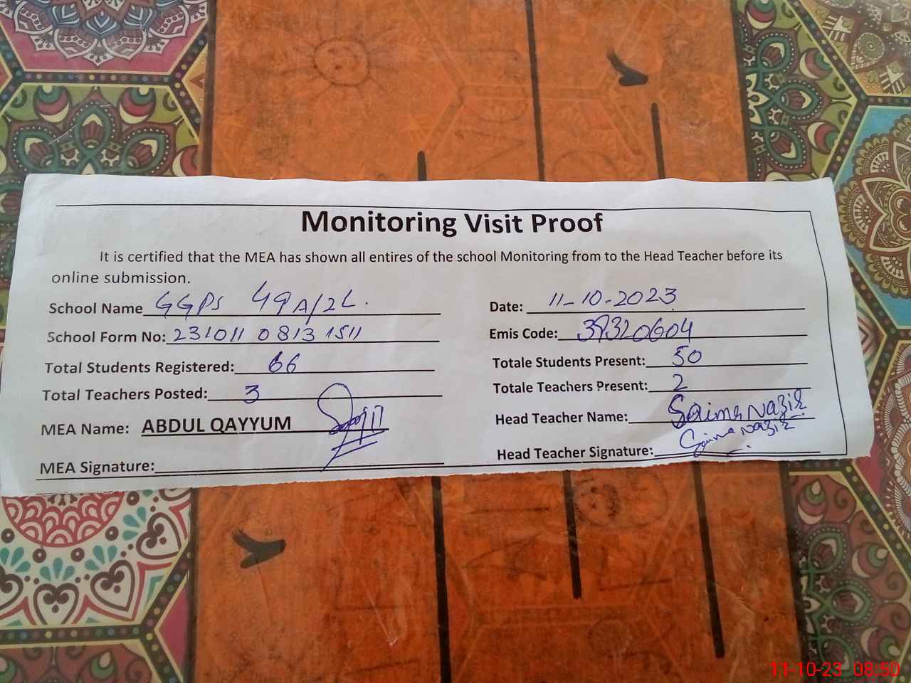 | Attendance Register | Head Teacher | MEA with School | Visit Proof |