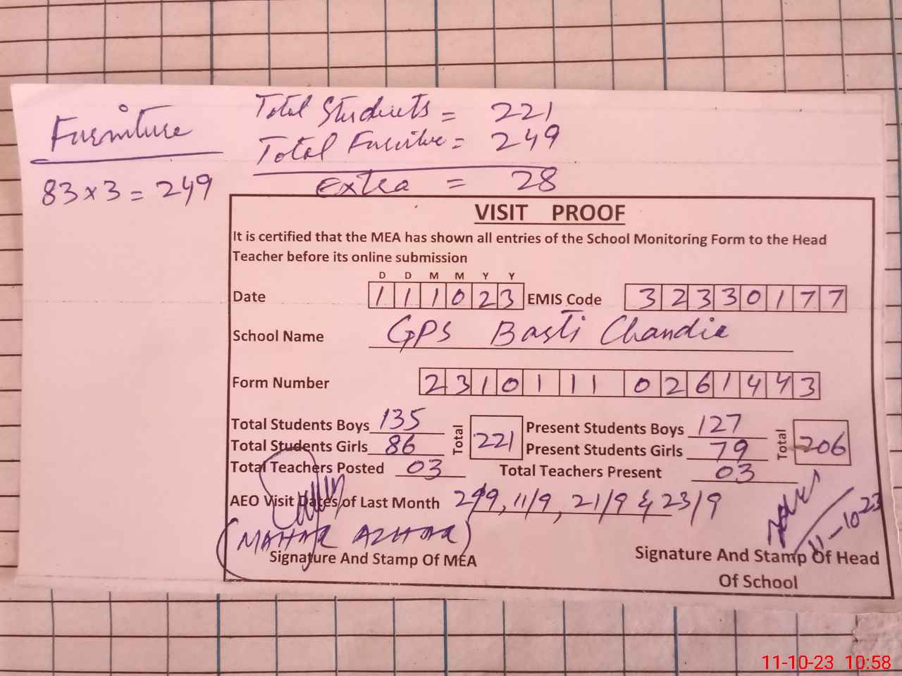 | Attendance Register | Head Teacher | MEA with School | Visit Proof |
