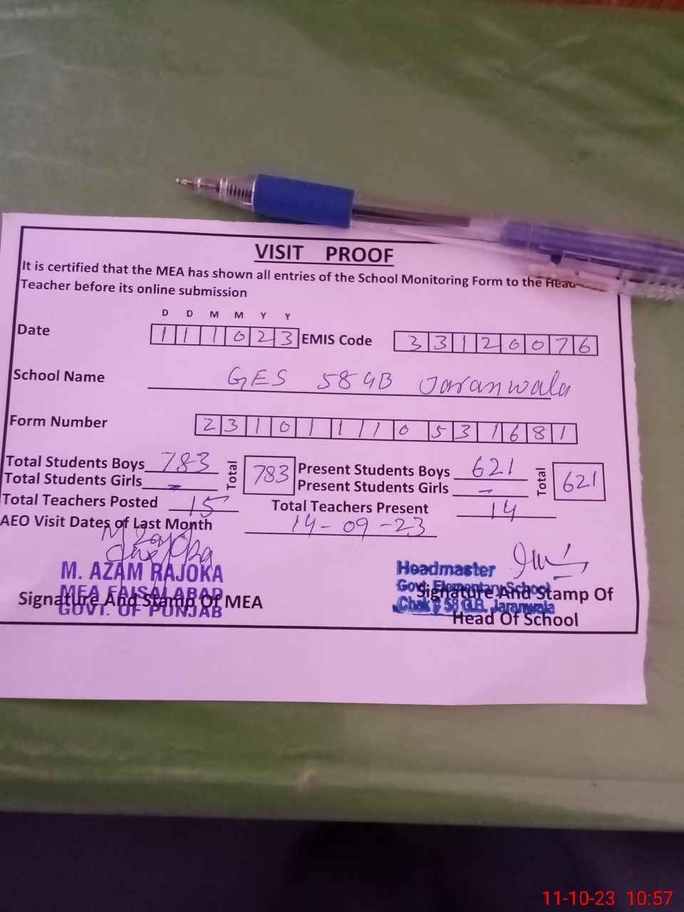 | Attendance Register | Head Teacher | MEA with School | Visit Proof |
