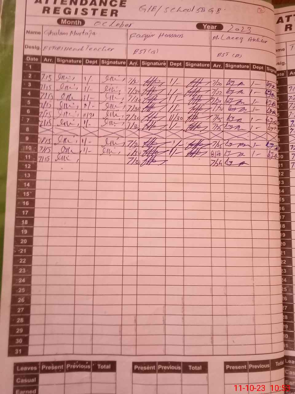 | No. of Students Present - Male | 31 | 0 | 37 | 46 | 43 | 58 | 65 | 74 | 95 | 89 | 83 | 621 | ||||
