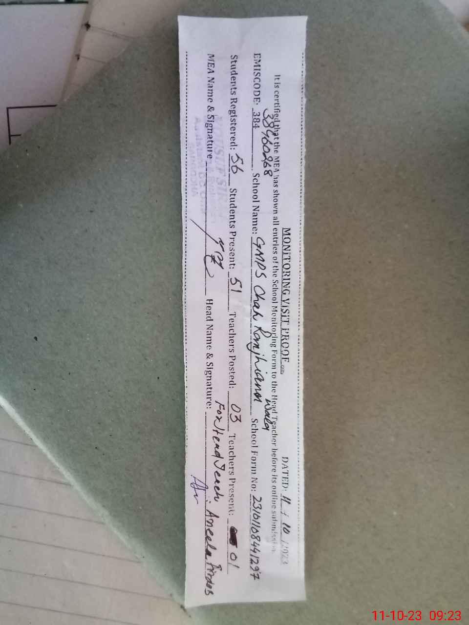 | Attendance Register | Head Teacher | MEA with School | Visit Proof |