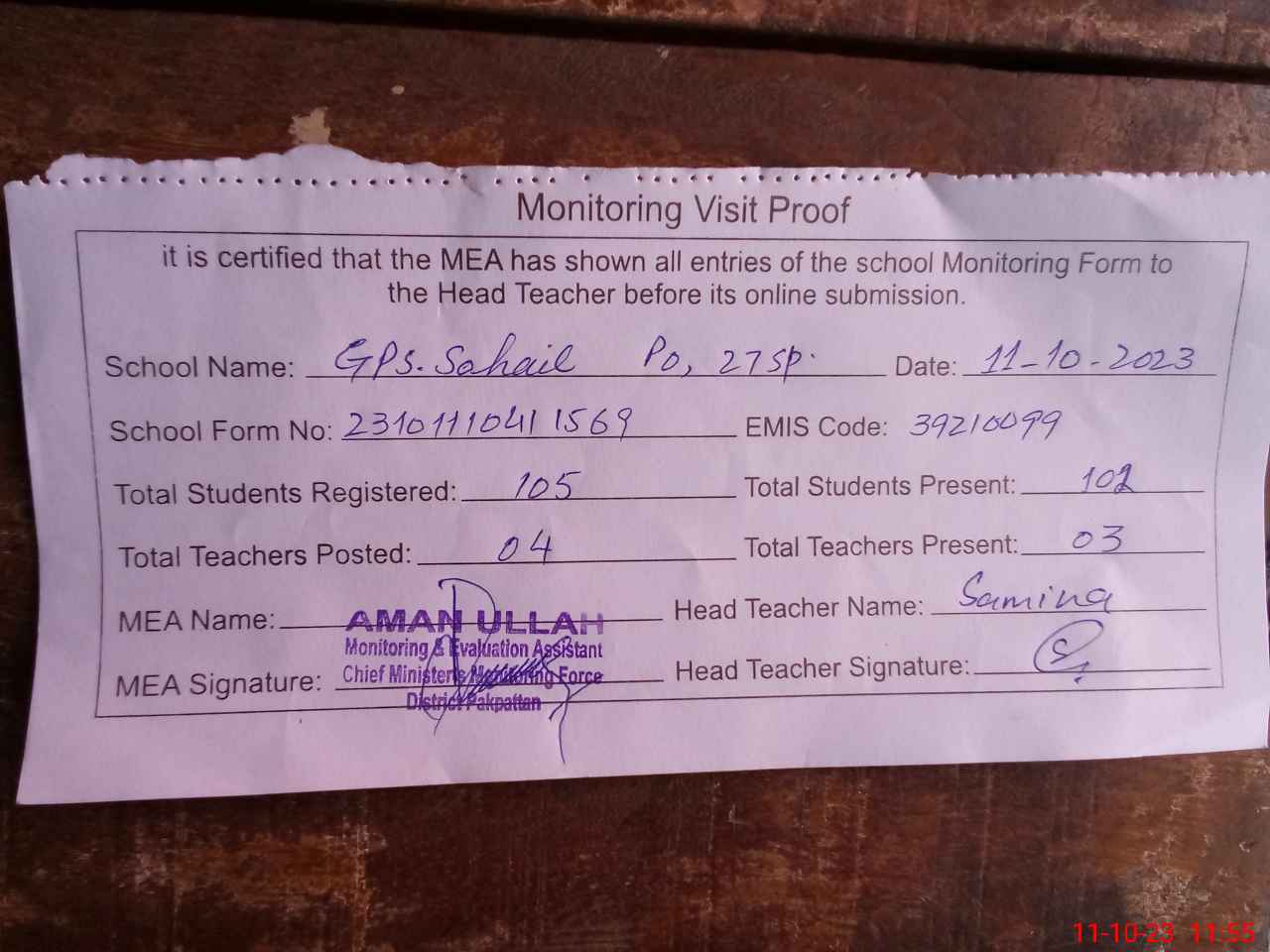 | Attendance Register | Head Teacher | MEA with School | Visit Proof |