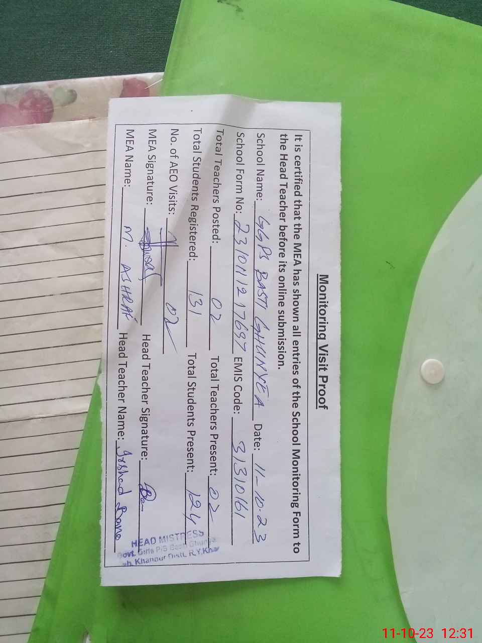 | Attendance Register | Head Teacher | MEA with School | Visit Proof |