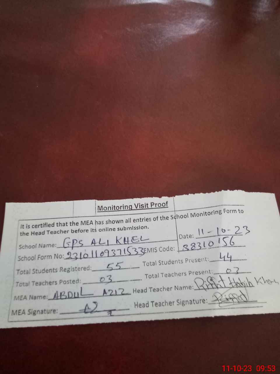 | Attendance Register | Head Teacher | MEA with School | Visit Proof |