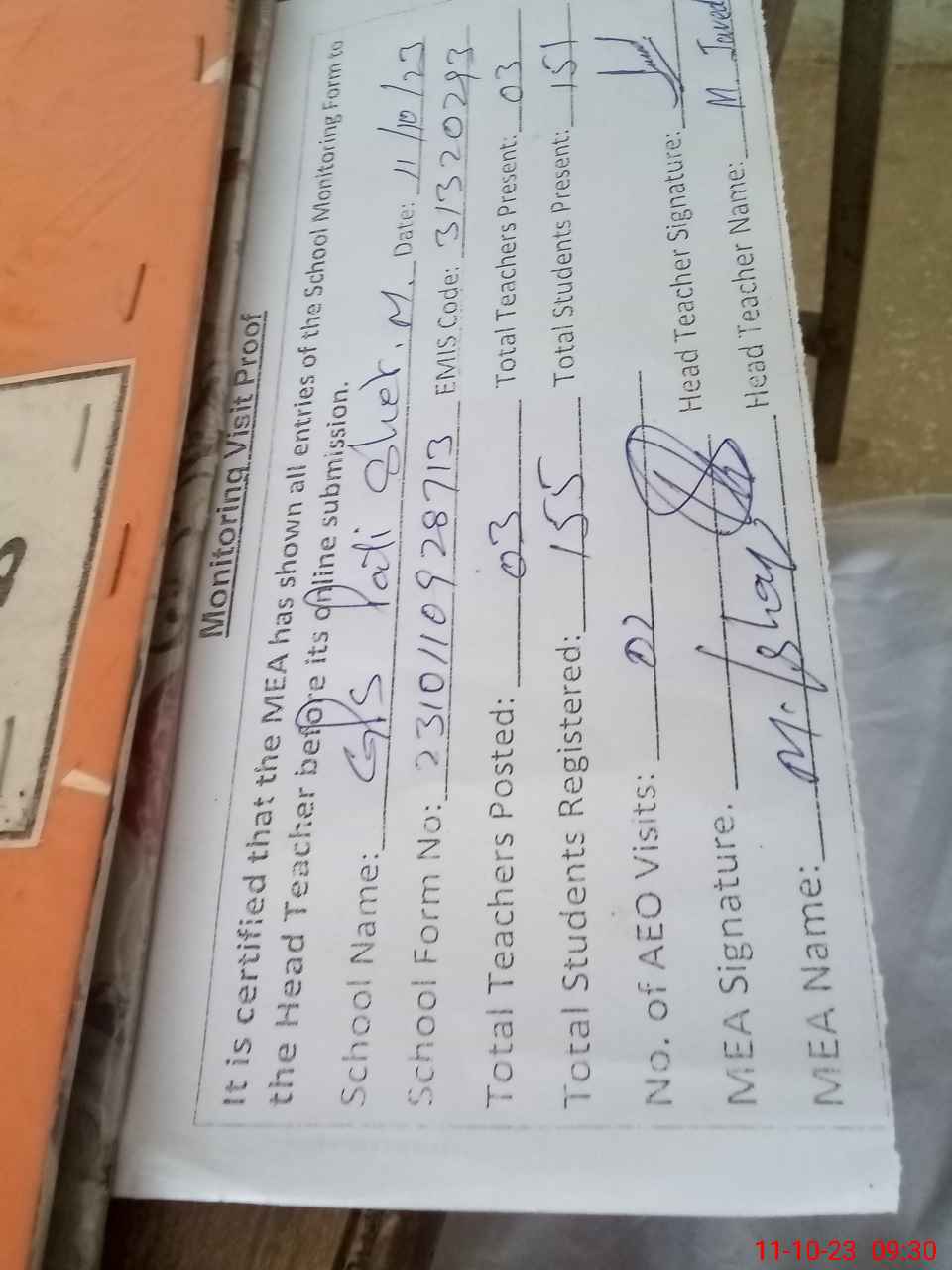 | Attendance Register | Head Teacher | MEA with School | Visit Proof |