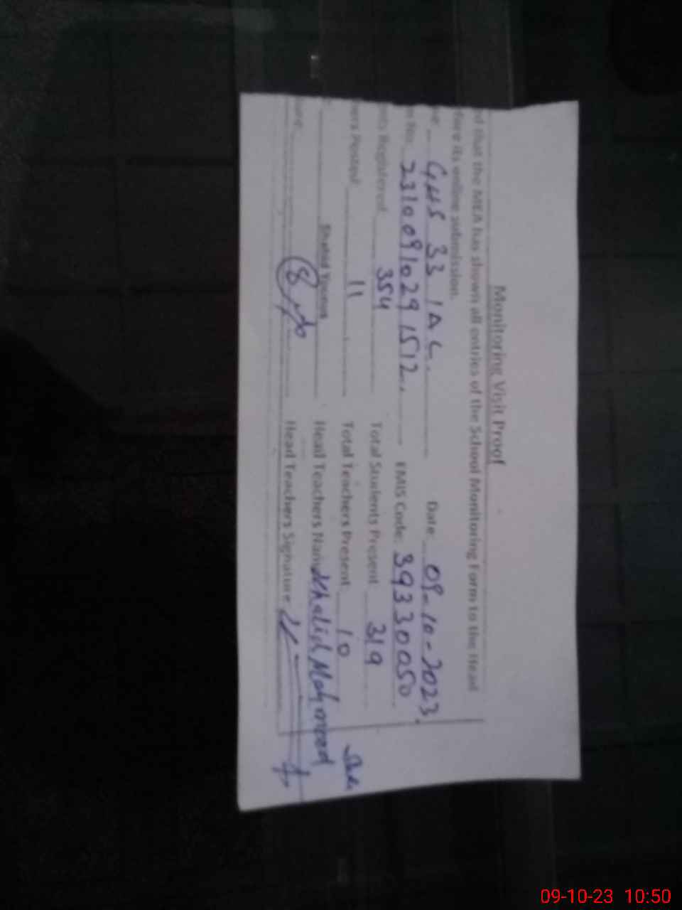 | Attendance Register | Head Teacher | MEA with School | Visit Proof |