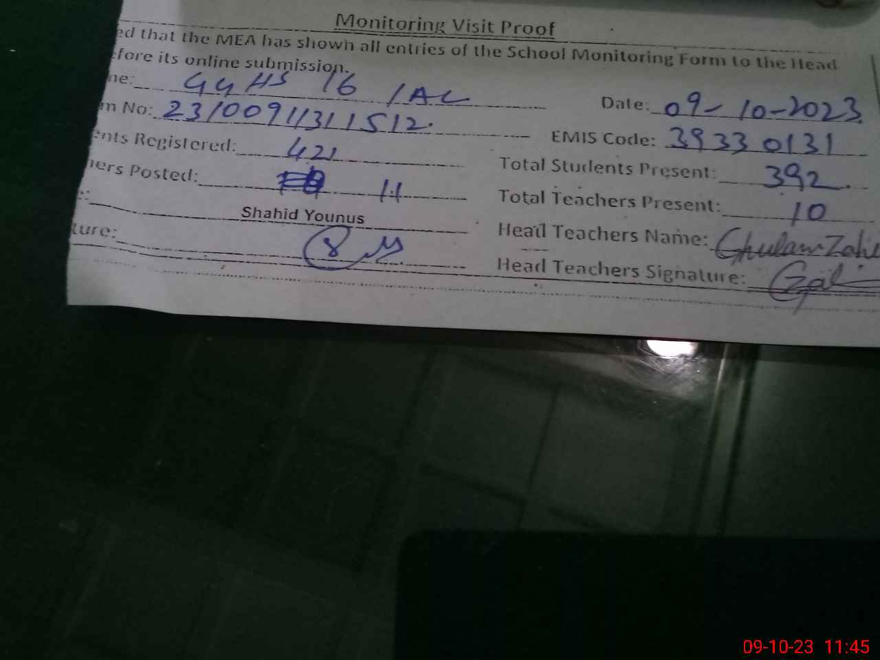 | Attendance Register | Head Teacher | MEA with School | Visit Proof |