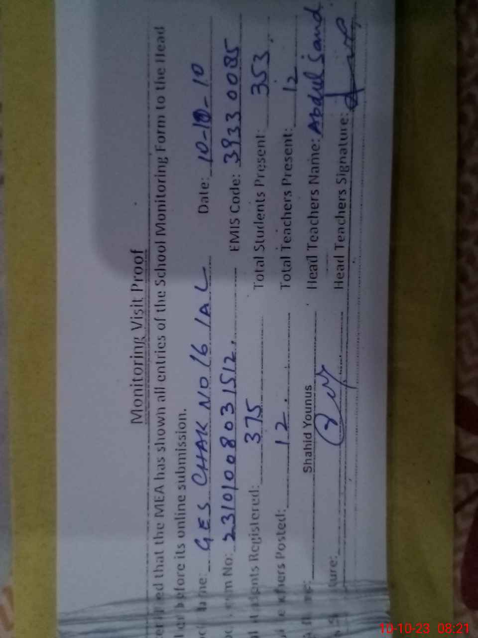 | Attendance Register | Head Teacher | MEA with School | Visit Proof |