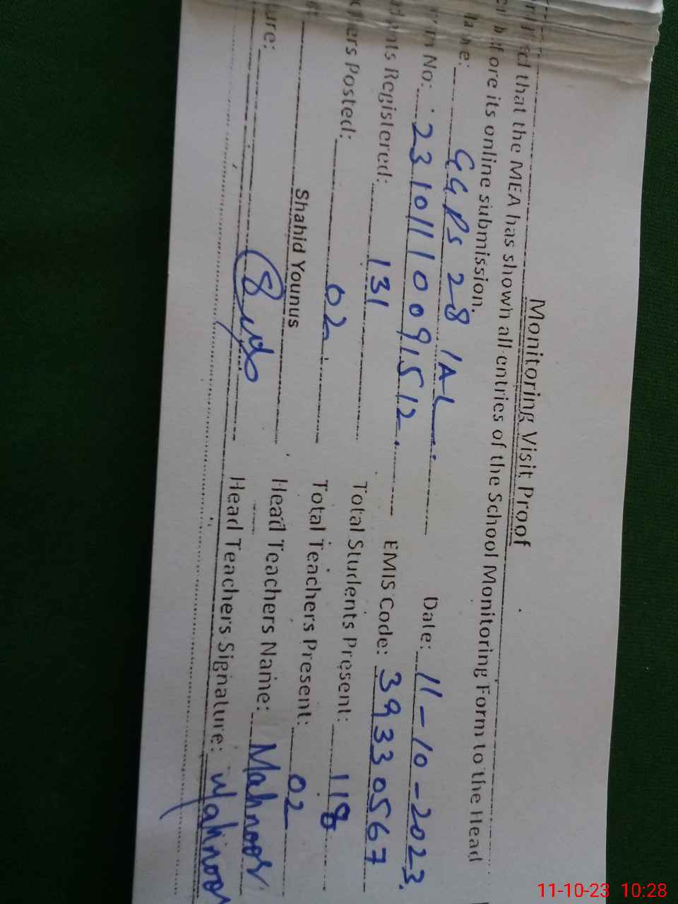 | Attendance Register | Head Teacher | MEA with School | Visit Proof |
