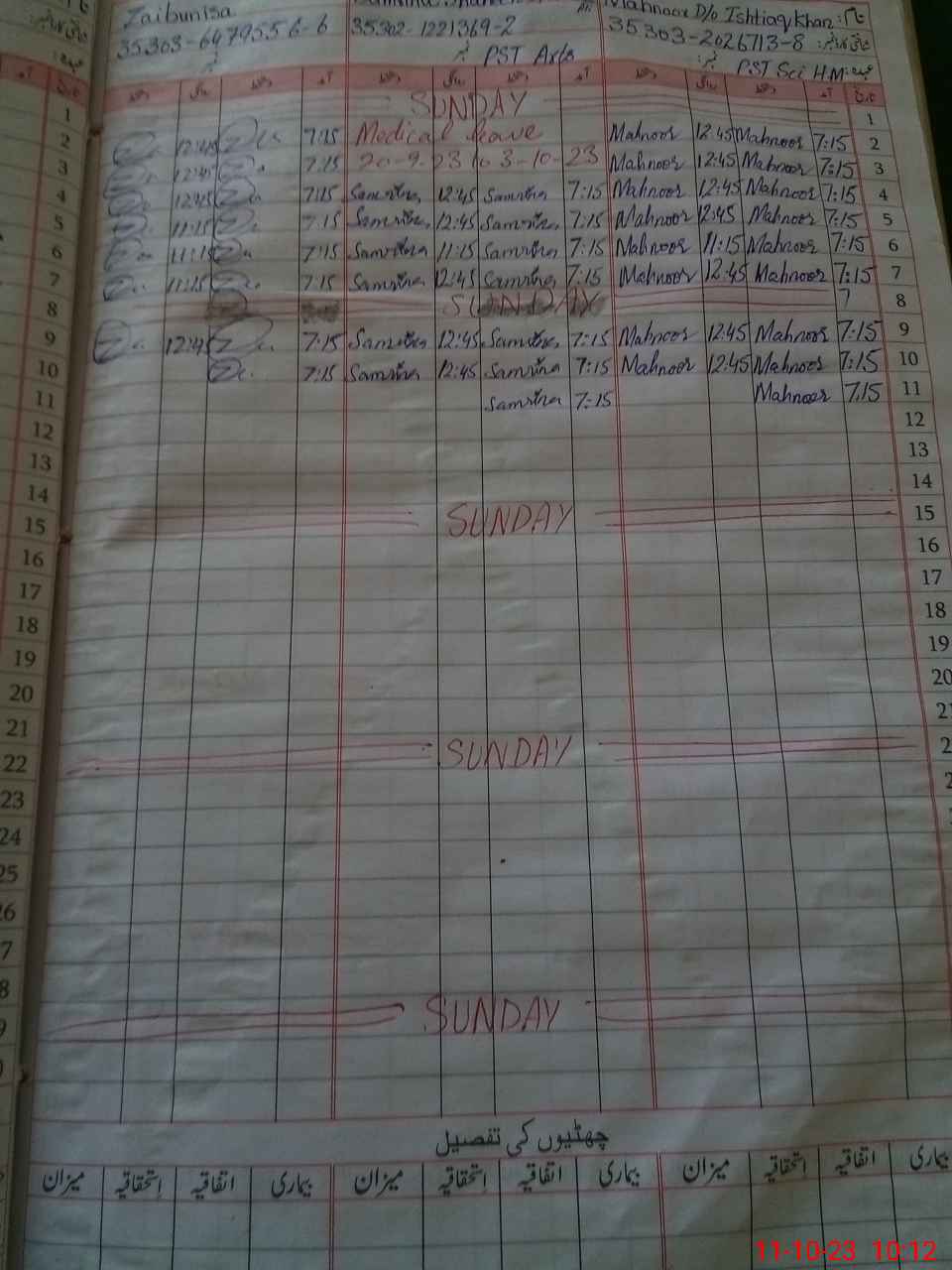 | CNIC | Full Name | Designation | R/C | Absence During Last Calender Month |