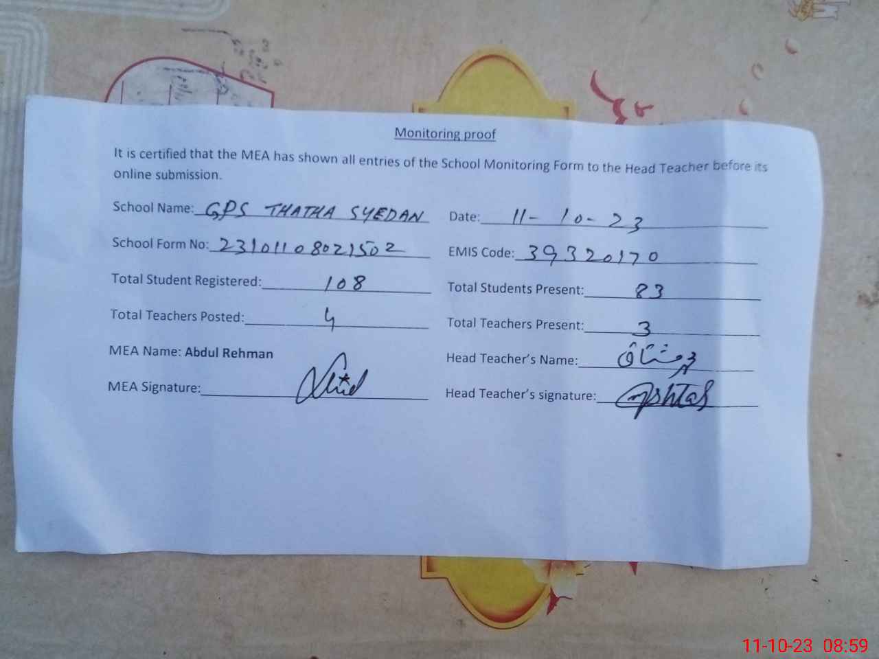 | Attendance Register | Head Teacher | MEA with School | Visit Proof |