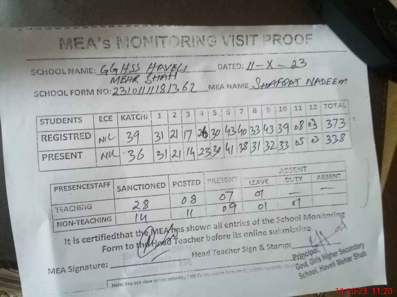 | Attendance Register | Head Teacher | MEA with School | Visit Proof |