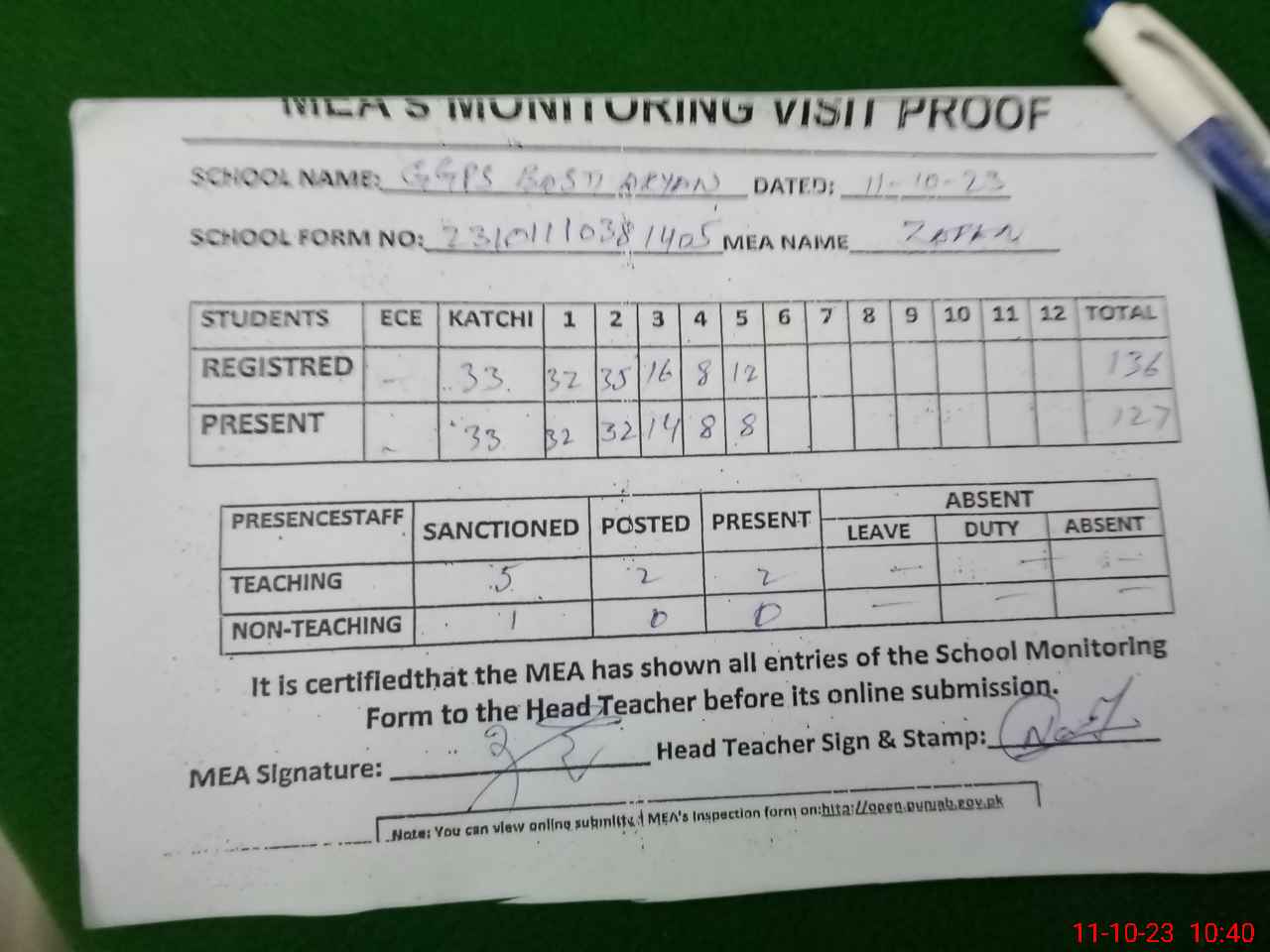 | Attendance Register | Head Teacher | MEA with School | Visit Proof |