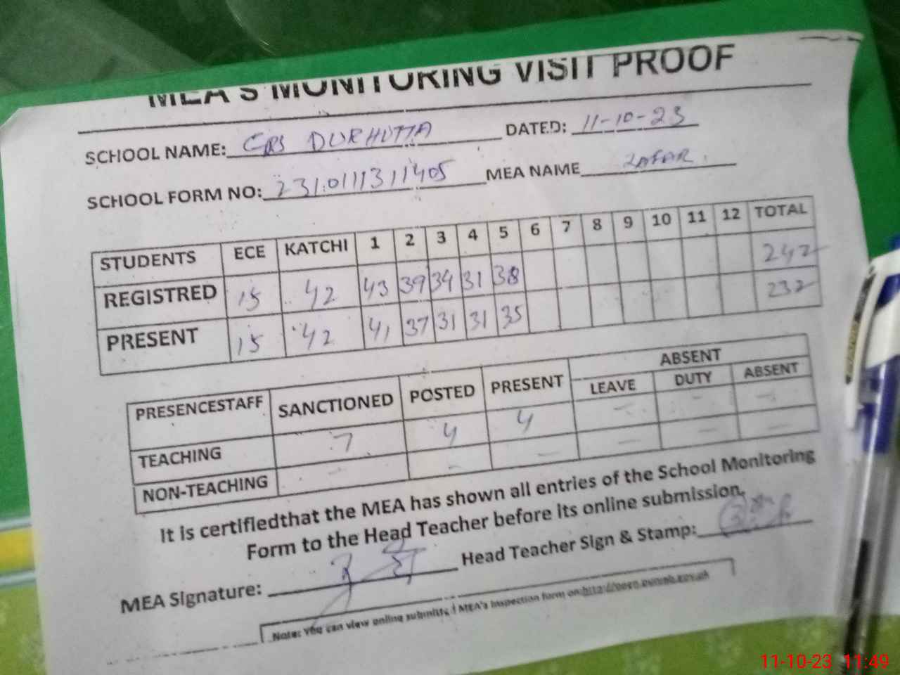 | Attendance Register | Head Teacher | MEA with School | Visit Proof |