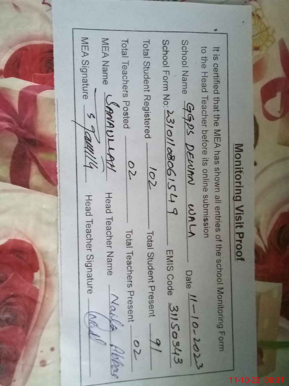| Attendance Register | Head Teacher | MEA with School | Visit Proof |