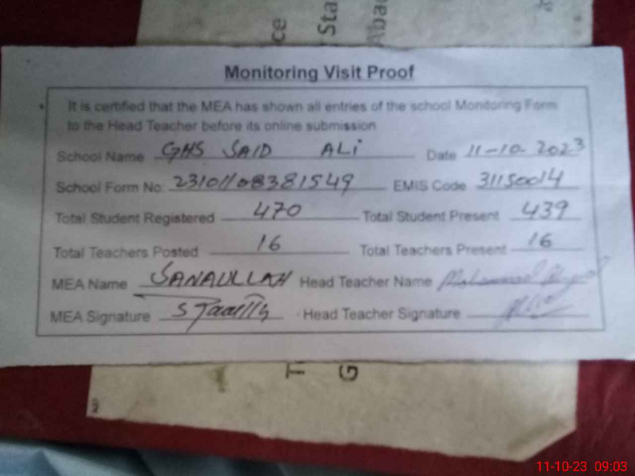 | Attendance Register | Head Teacher | MEA with School | Visit Proof |