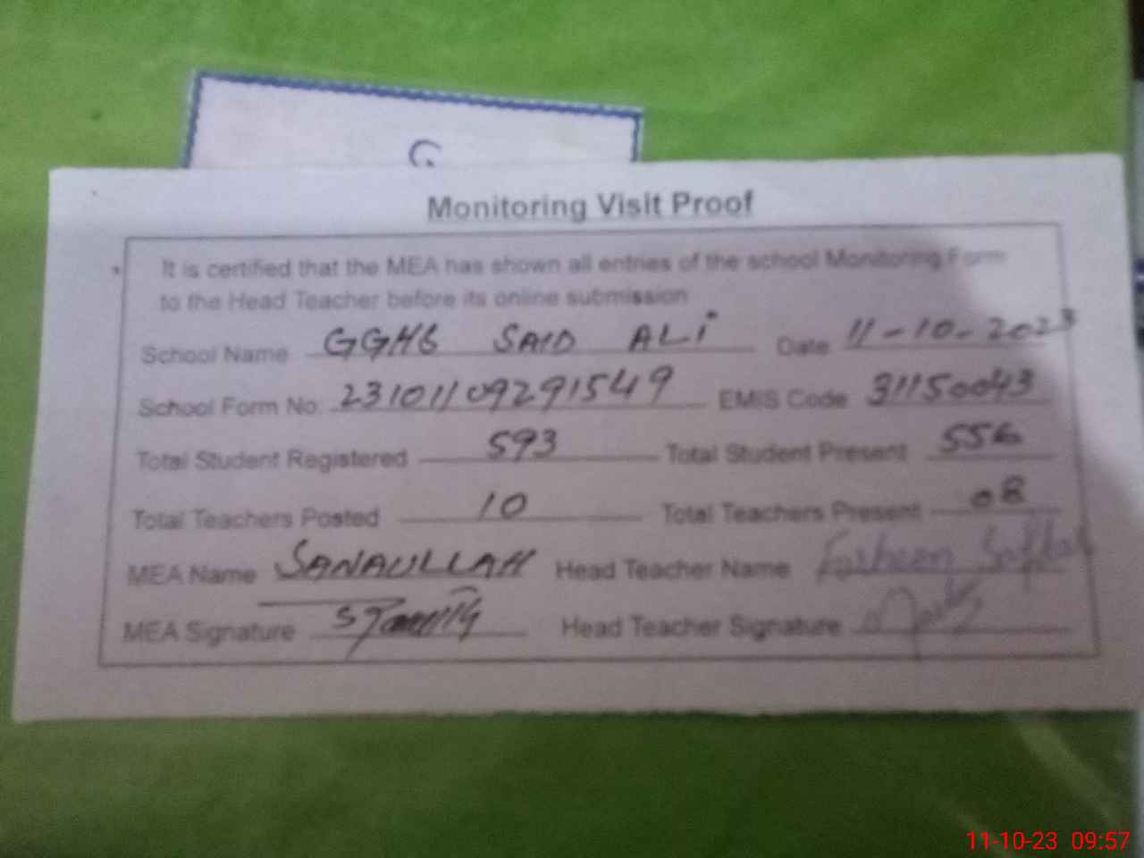 | Attendance Register | Head Teacher | MEA with School | Visit Proof |