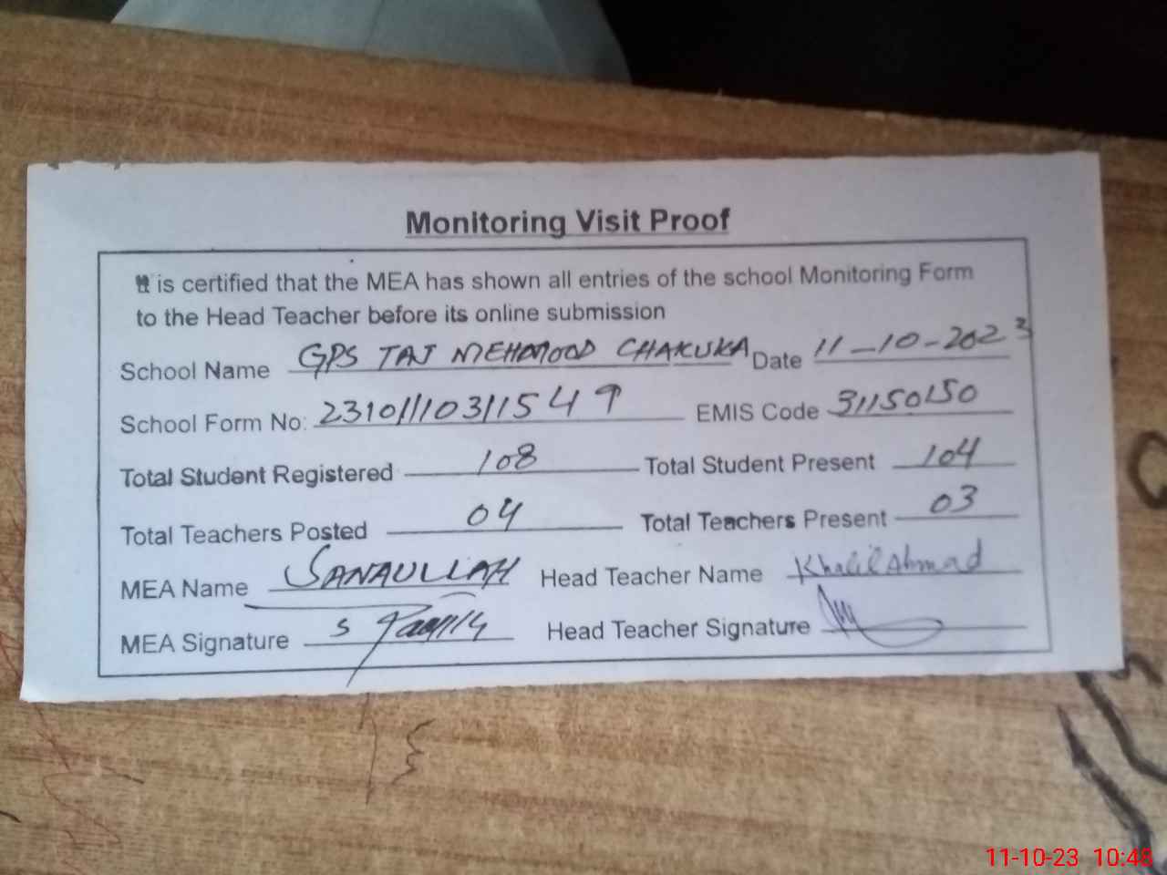 | Attendance Register | Head Teacher | MEA with School | Visit Proof |