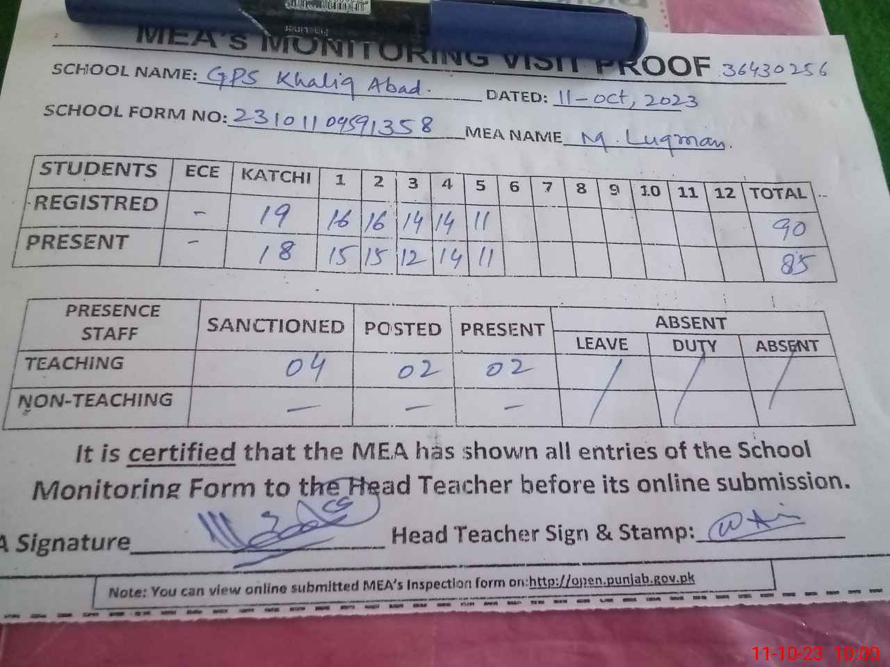 | EMIS Code: 36430256 | Name of School: GPS KHALIQ ABAD, P/O 11-A/8R, TULAMBA | |||