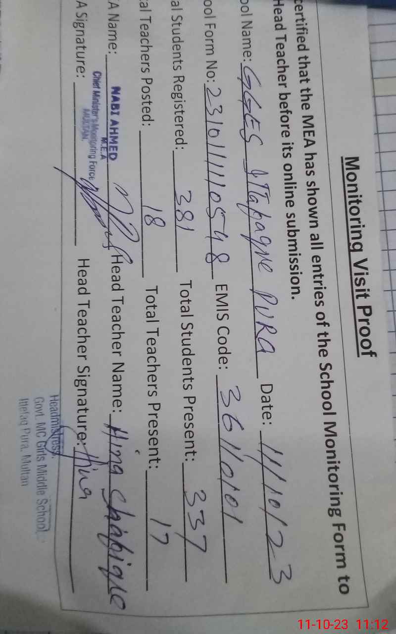 | EMIS Code: 36110101 | Name of School: GGES MC ITTEFAQ PURA MULTAN | |||