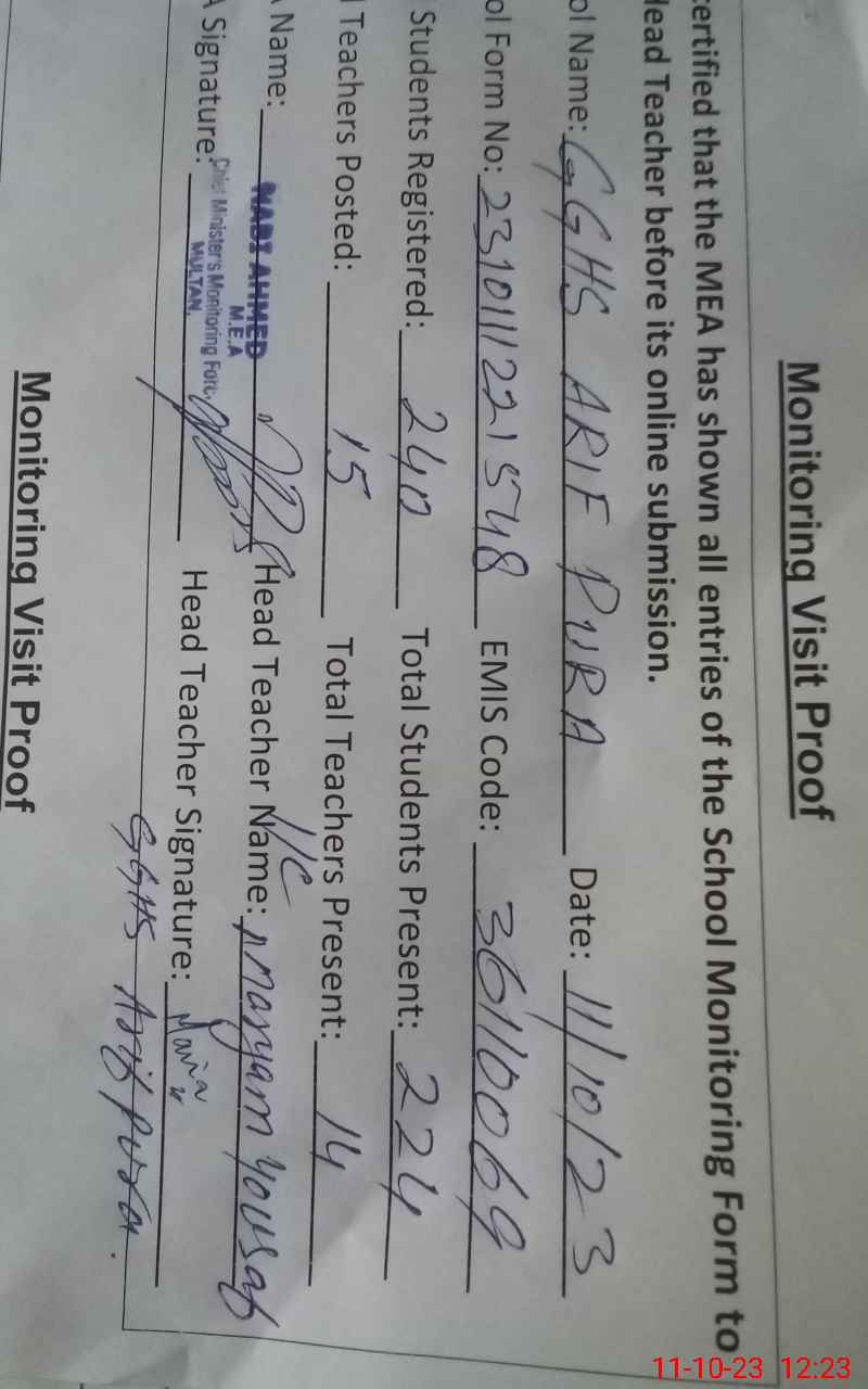 | EMIS Code: 36110069 | Name of School: GGHS ARIF PURA MULTAN | |||