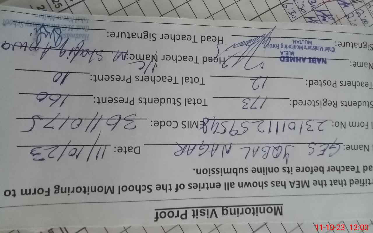 | Monitoring Date: 11-10-2023 | Start Time: 11-10-2023 12:30 PM | End Time: 11-10-2023 01:09 PM | Name of MEA: NA**** AH**** | |