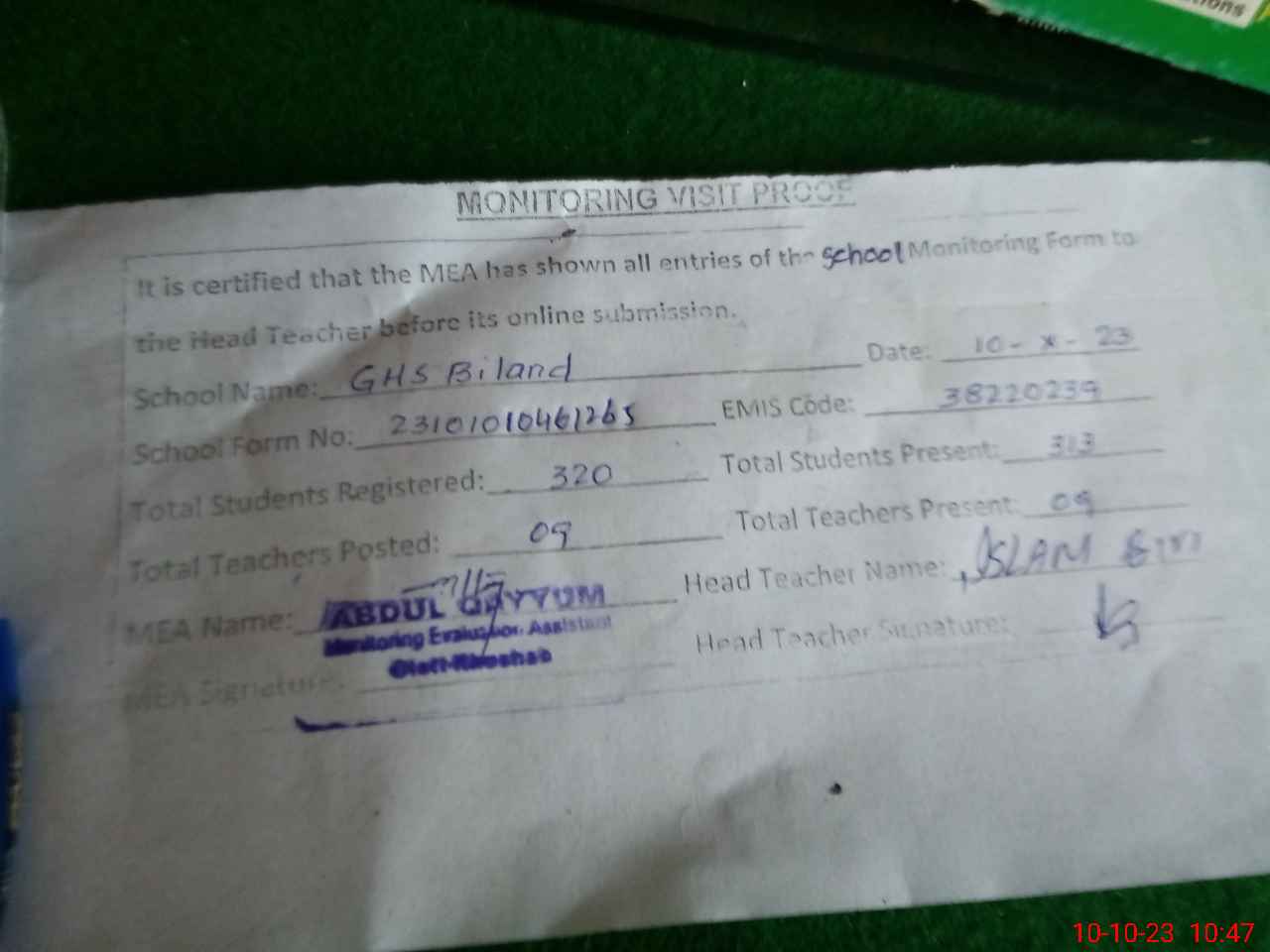 | Certified that this School was Inspected by the Undersigned MEA/DMO Today and the Information Stated Above is as Per Record. | |||||