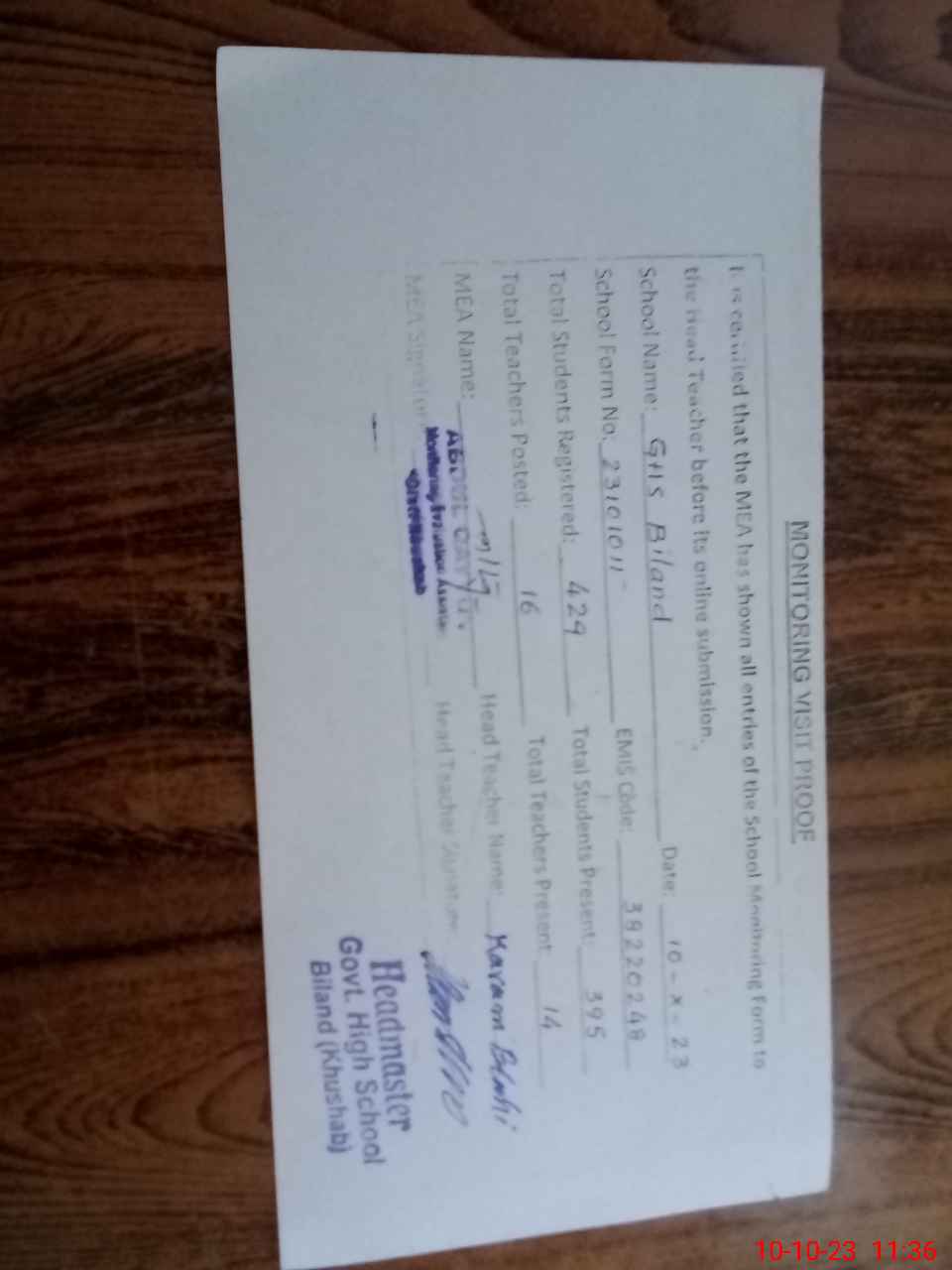 | Certified that this School was Inspected by the Undersigned MEA/DMO Today and the Information Stated Above is as Per Record. | |||||