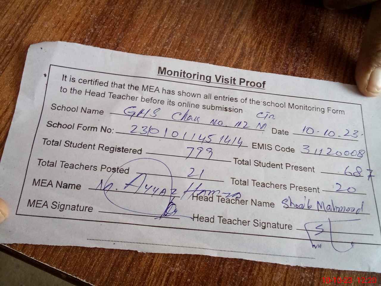| Attendance Register | Head Teacher | MEA with School | Visit Proof |