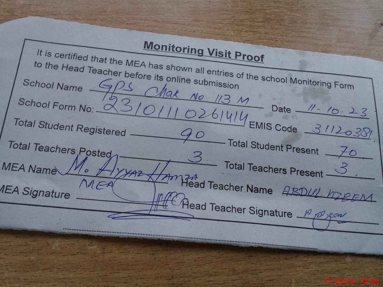 | EMIS Code: 31120381 | Name of School: GPS CHAK NO. 113 M | |||