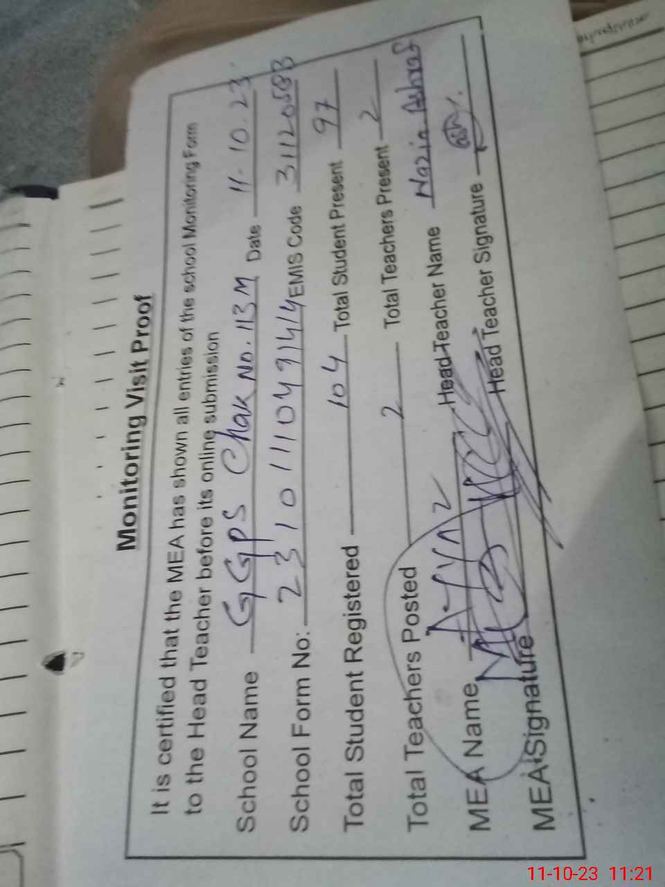 | Attendance Register | Head Teacher | MEA with School | Visit Proof |