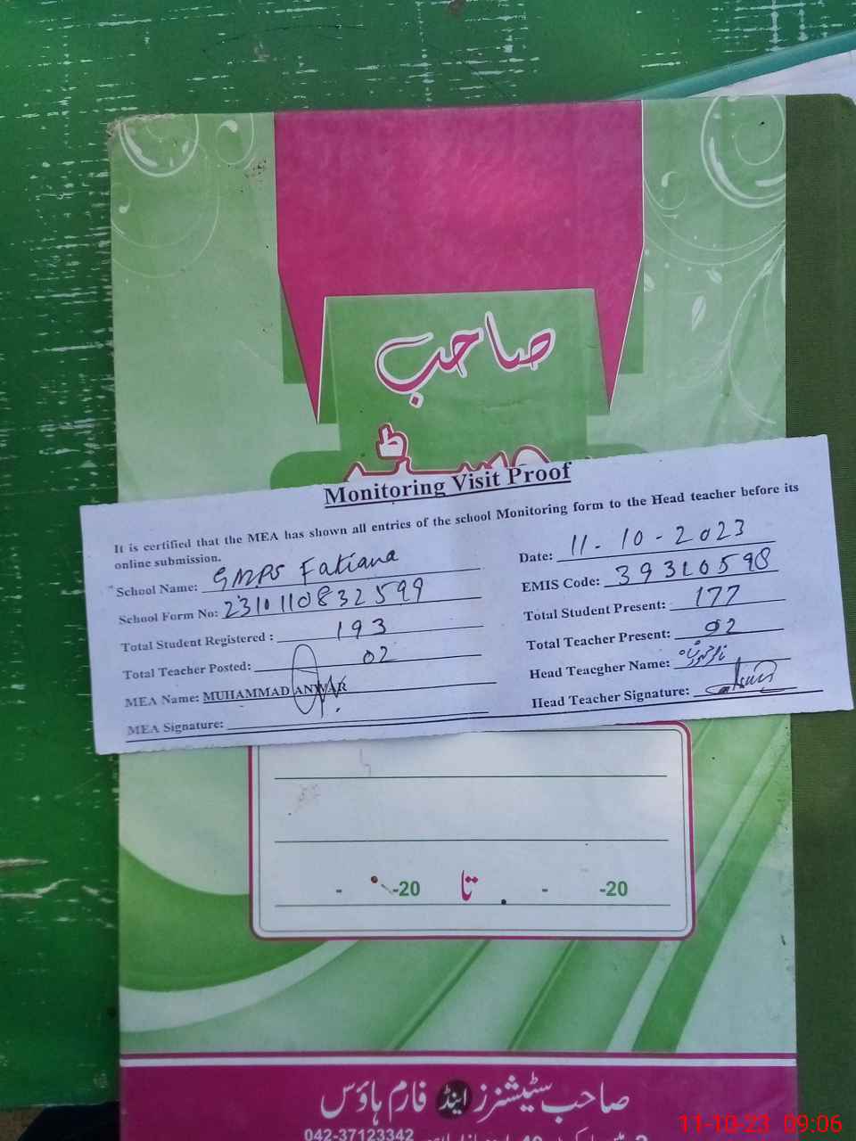 | Attendance Register | Head Teacher | MEA with School | Visit Proof |