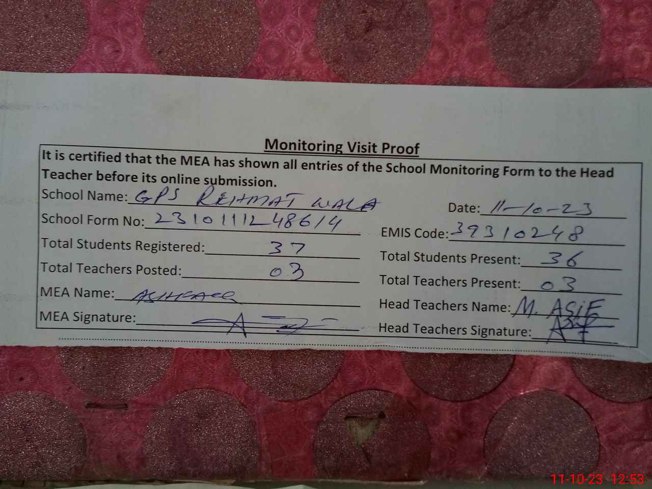| EMIS Code: 39310248 | Name of School: GPS REHMAT WALA | |||
