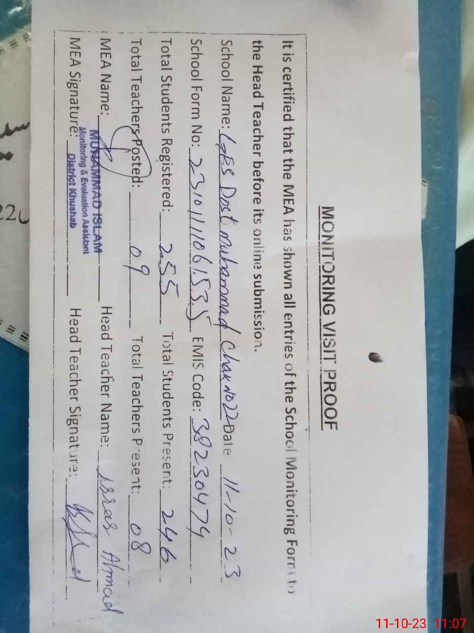 | EMIS Code: 38230474 | Name of School: GES DOST MUHAMMAD CHAK NO. 22 MB | |||